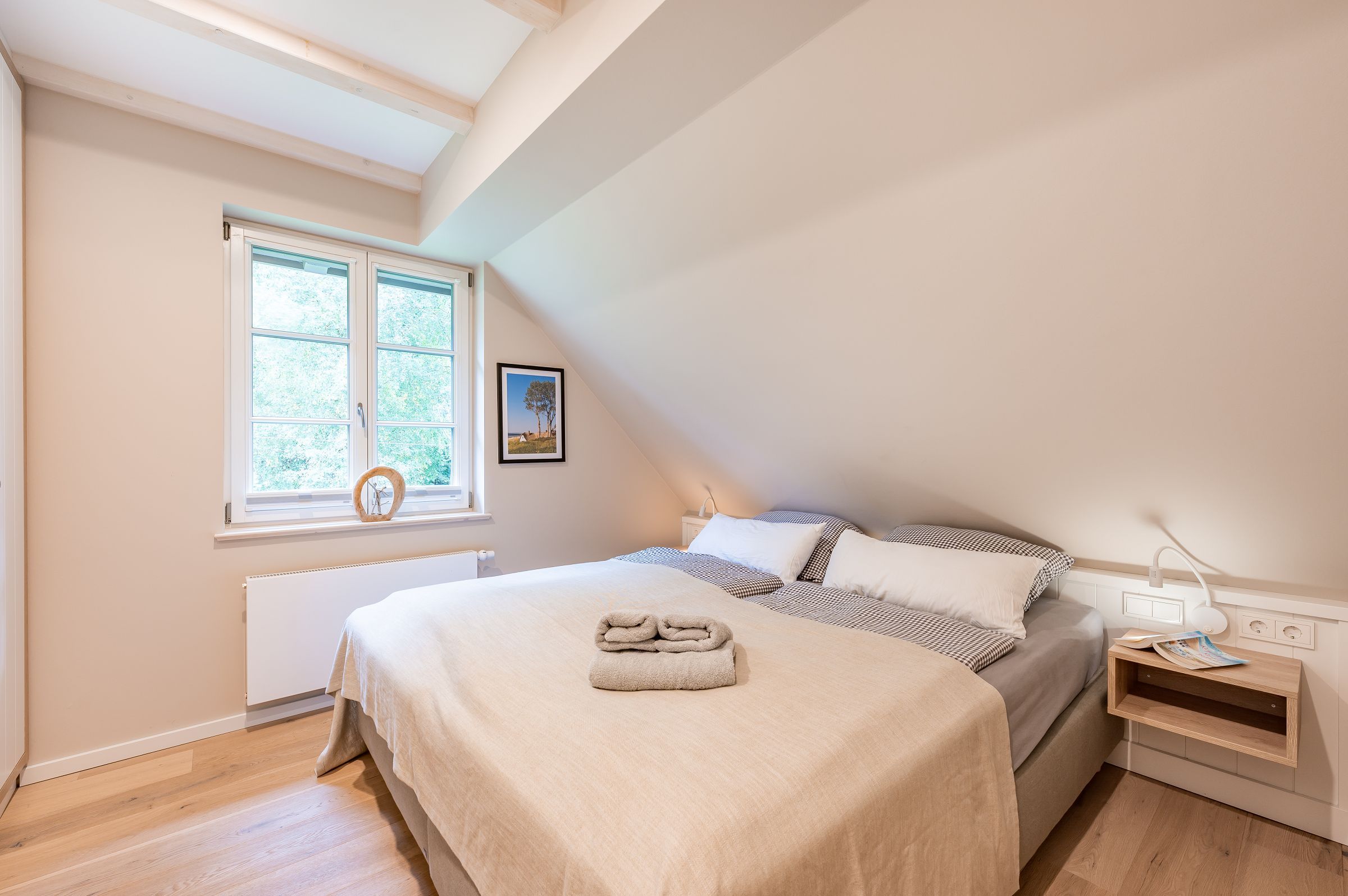 Für erholsame Nächte sorgen zwei komfortable Schlafzimmer: Eines mit einem großzügigen Boxspringdoppelbett (1,80 x 2,10 m), das andere mit zwei Einzelbetten (je 90 x 200 cm). Beide Zimmer verfügen über einen Kleiderschrank und jeweils einen Flat-TV. Zwei moderne Bäder mit Dusche und WC bieten ausreichend Raum zum Frischmachen. Das Badezimmer im Erdgeschoss ist zusätzlich mit einer finnischen Sauna ausgestattet. Handtücher liegen bei Anreise bereit, und die Betten sind bereits bezogen.