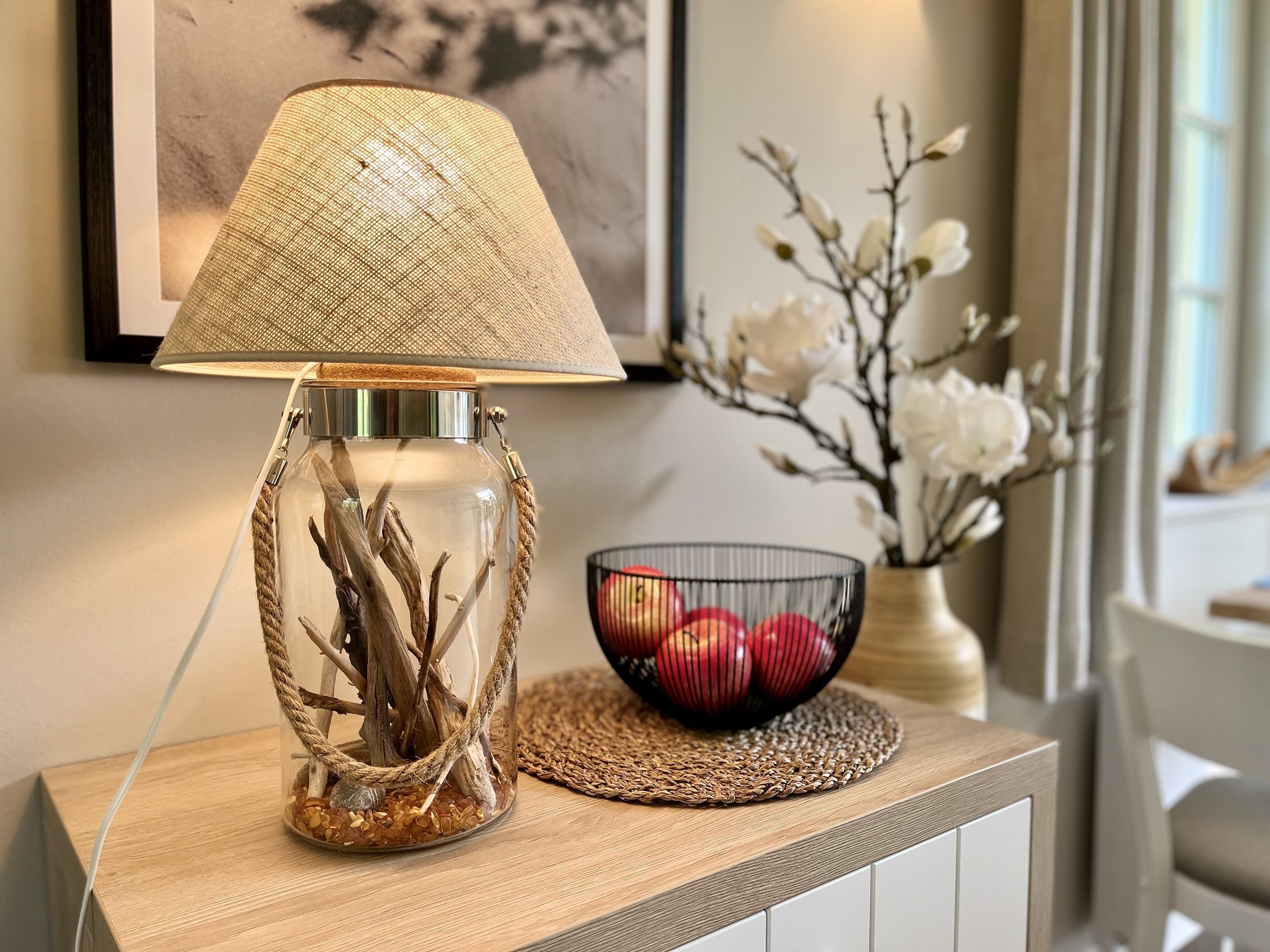Im Inneren erwartet Sie eine liebevoll eingerichtete Ferienhaushälfte mit nordisch-noblem Stil. Möbel, Lampen und Bilder sind geschmackvoll aufeinander abgestimmt. Ein Sofa mit Ottomane lädt zum Entspannen ein. Im Wohn-Esszimmer sorgen ein Kamin und ein Flat-TV für Gemütlichkeit, WLAN steht Ihnen kostenfrei zur Verfügung. Am stilvollen Esstisch mit vier Stühlen lassen sich gemeinsame Mahlzeiten genießen.