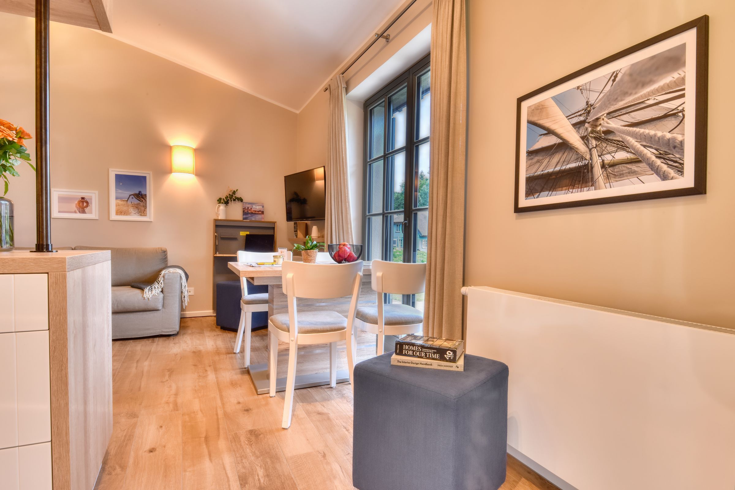 Im Feriendorf Klein Stresow werden Sie auf 53 Quadratmeter in Ihrer eigenen, stylischen Ferienhaushälfte mit Gründach und Weitblick begrüßt . Hier beginnt der Urlaub für 2 Personen schon beim Eintreten. Wenn Sie es genau nehmen, schon beim Ankommen. Das Auto auf dem für Sie reservierten Stellplatz abgestellt, können Sie bei so viel sonniger Leichtigkeit erst einmal richtig durchatmen. Verweilen Sie auf der 7m² großen Sonnenterrasse mit Meerblick und genießen die frische Ostseebrise. Hier lässt es sich ausgezeichnet frühstücken. Das Innere Ihrer Ferienhaushälfte ist bis ins Detail aufs Feinste eingerichtet. Lampen, Möbel und Bilder sind nordisch nobel. Zwei Sofas laden zum Relaxen ein, ein großer lichtdurchfluteter Wohnraum von 28m² mit über 3 Meter Deckenhöhe. Zur Ausstattung des Wohn-Esszimmers gehört ein Flat-TV. Das WLAN können Sie kostenfrei nutzen. Ein schöner Esstisch mit vier Stühlen eignet sich bestens für die Mahlzeiten.
