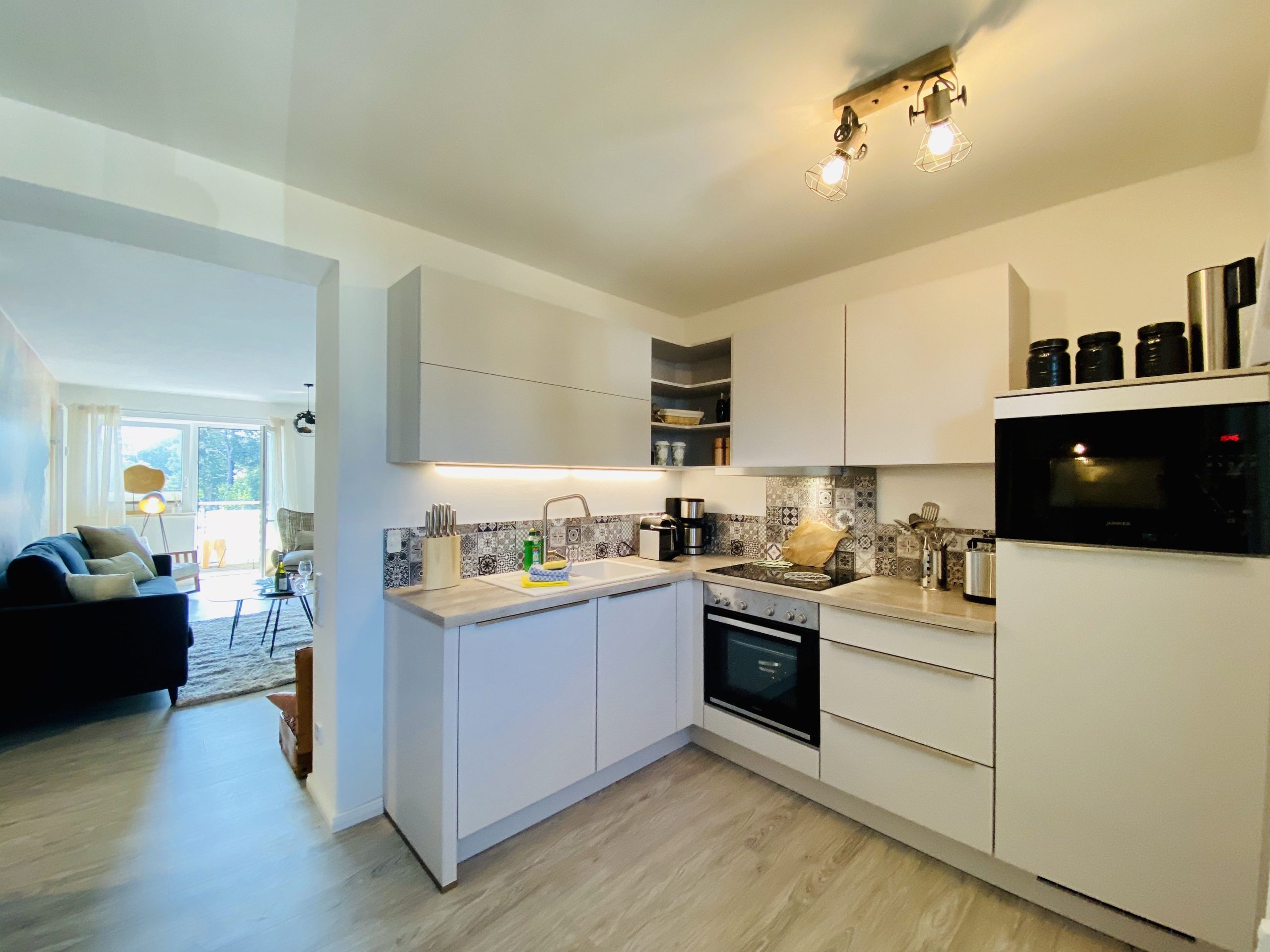 Der Wohnraum beginnt mit einer großen Eckküche, die überaus gut ausgestattet ist und zu geselligen Kochabenden mit der Familie einlädt. Für Frühstück, Mittag und Abendbrot ist die Ausstattung der Küche ideal ausgelegt. Auch Backzubehör ist vorhanden. An Elektrogeräten findet der Gast hier neben Geschirrspüler, Waschmaschine, Backofen und Kühlschrank mit Gefrierfach auch Kleingeräte wie Wasserkocher, Kapselmaschine für Kapseln der Marke Nespresso, Filterkaffeemaschine, Toaster und Rührbesen sowie eine Mikrowelle.