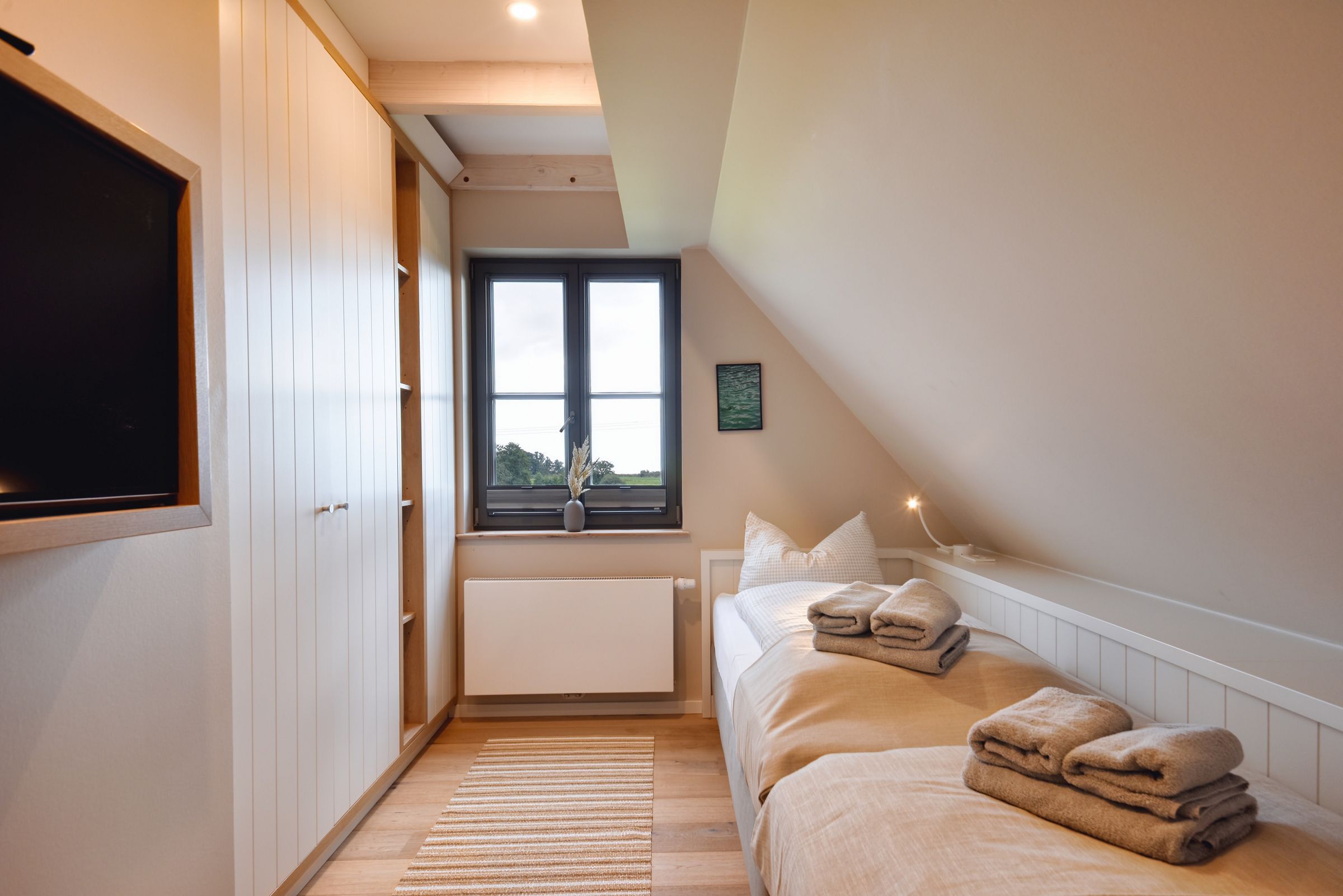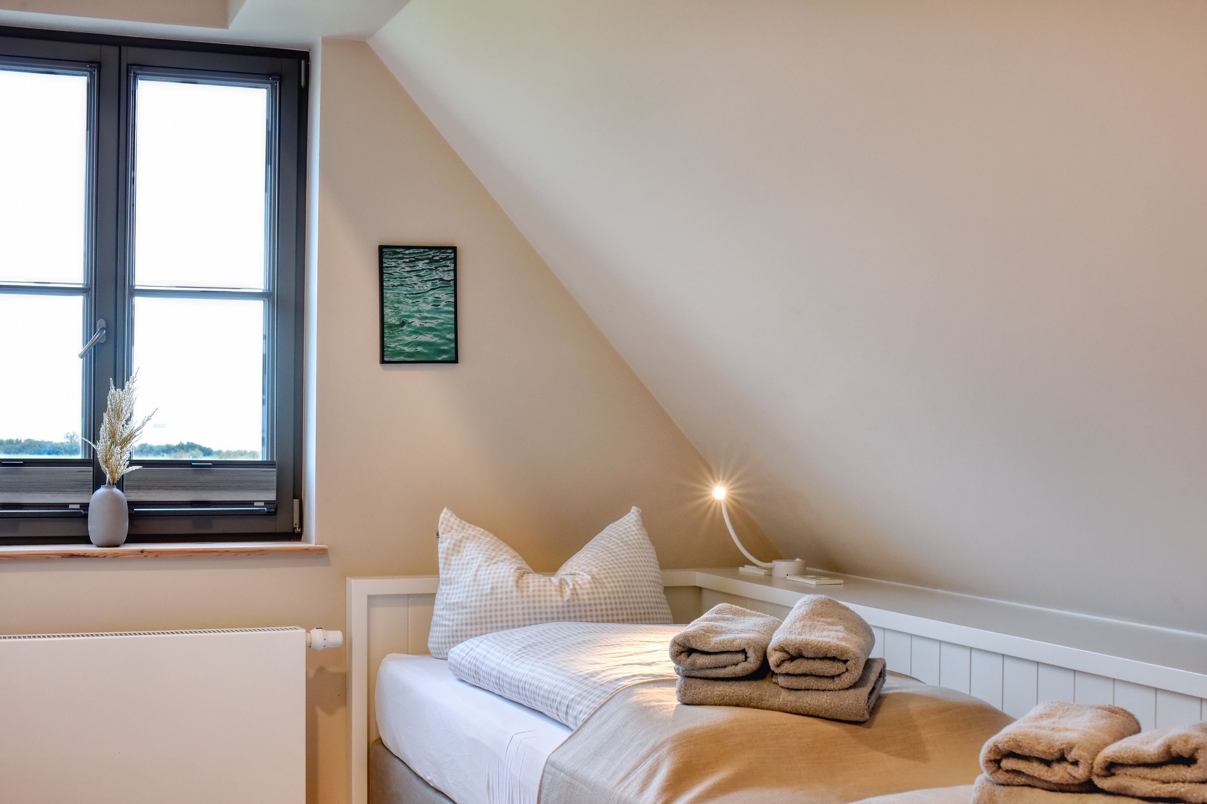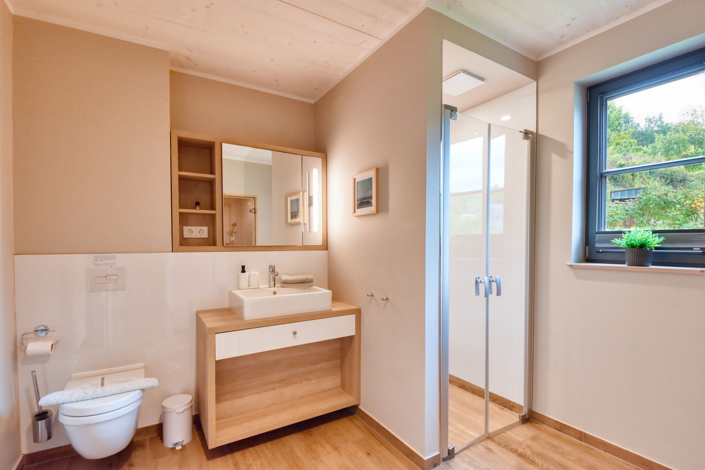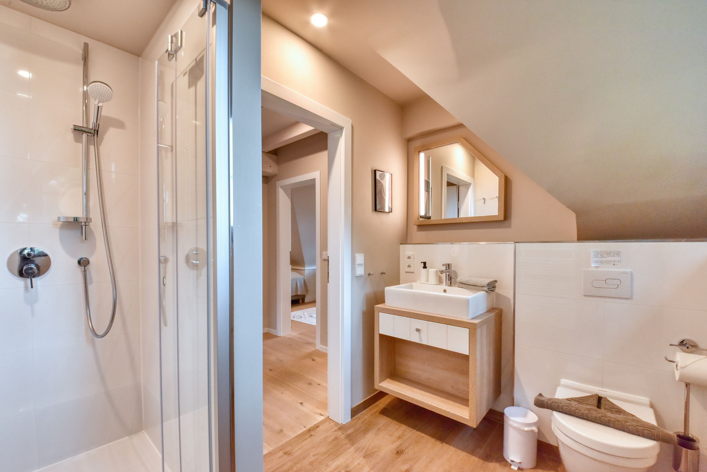 Zwei Badezimmer, eines davon mit bodengleicher Dusche und Badewanne, sorgen für Komfort und Flexibilität, ergänzt durch ein Gäste-WC. Handtücher, Bade- und Kosmetiktücher, Bettwäsche sowie ein Haartrockner und Kosmetikspiegel sind vorhanden. Weiterhin sind im Haus Waschmaschine, Trockner, Bügeleisen und Wäscheständer eingerichtet, was besonders längere Aufenthalte angenehm gestaltet. Neben der Fußbodenheizung sorgt die Zentralheizung für eine behagliche Temperatur.
