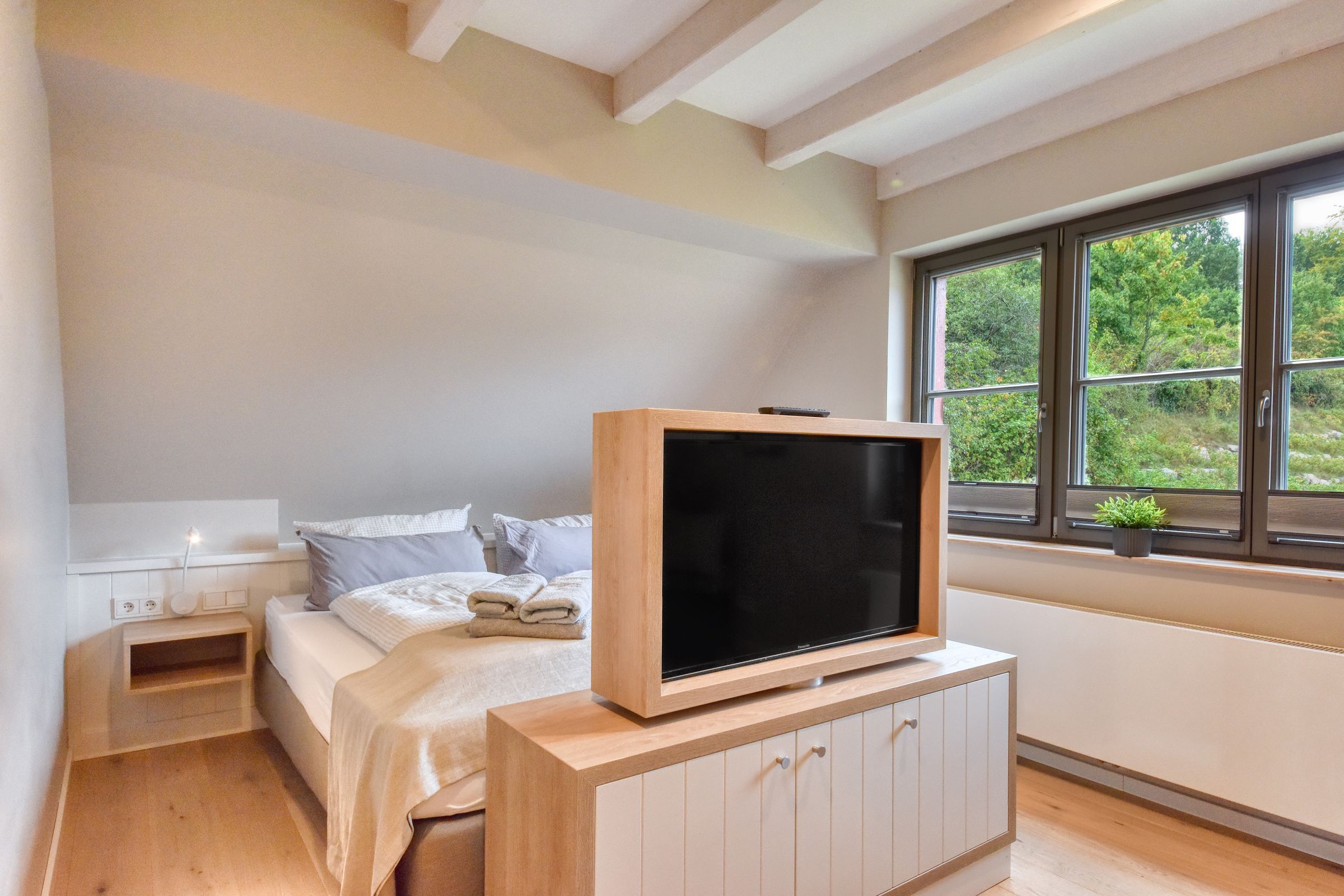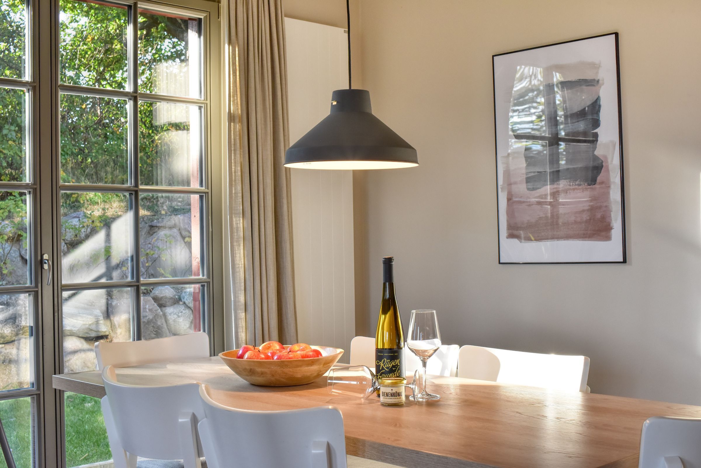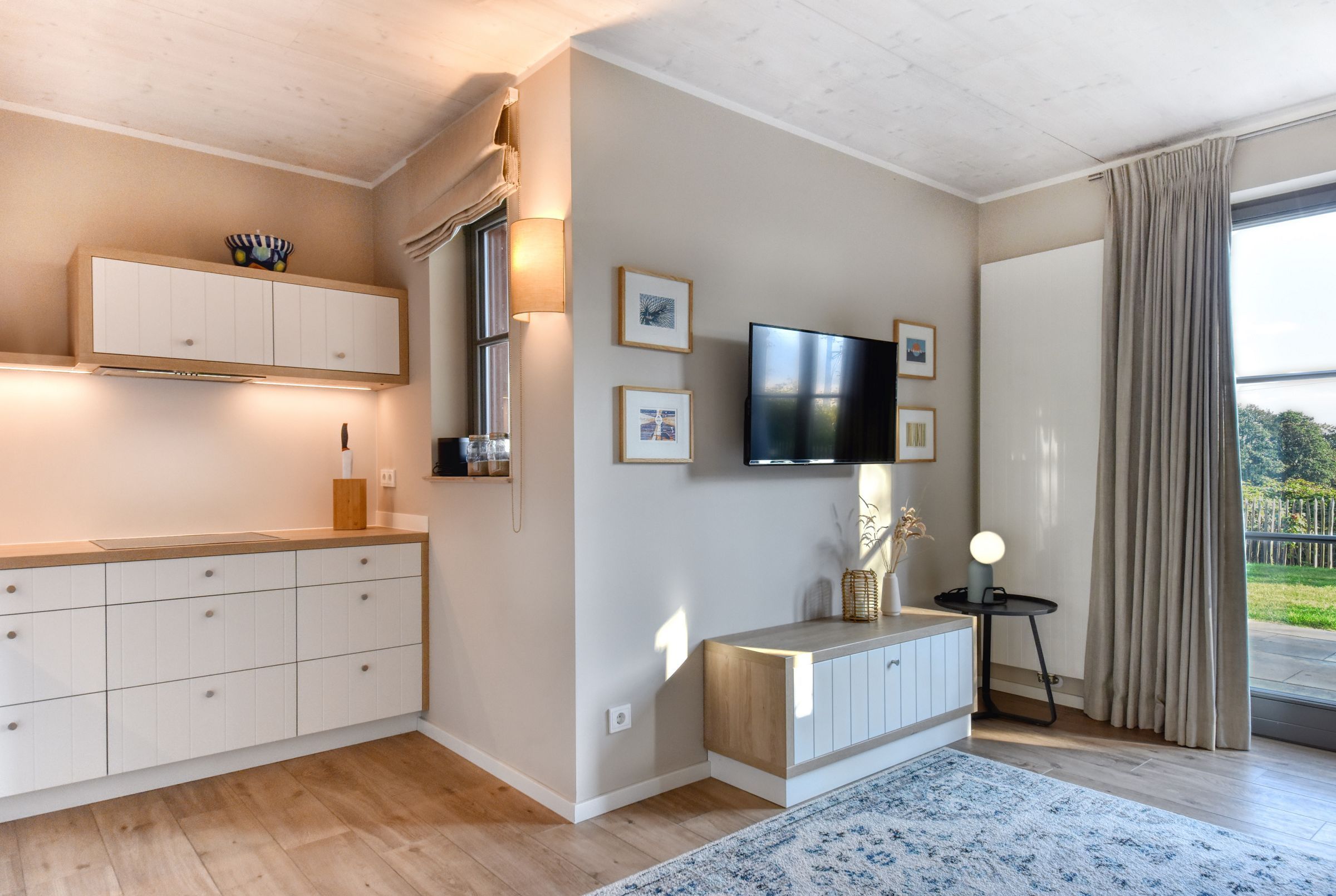 Zur Unterhaltung stehen ein Fernseher mit Satellitenanschluss sowie WLAN-Internet zur Verfügung. Zusätzlich ist eine umfangreiche Erstausstattung an Haushaltsgeräten und Geräten, darunter Staubsauger, vorhanden. Ein privat nutzbarer Parkplatz für zwei Fahrzeuge rundet das Angebot ab. Aufgrund der Lage in einem ländlichen Gebiet ist ein Auto zum individuellen Erreichen von Einkaufsmöglichkeiten, Stadtzentrum, Bahnhof und Fähre empfehlenswert. Restaurants sind nur etwa 200 Meter entfernt.