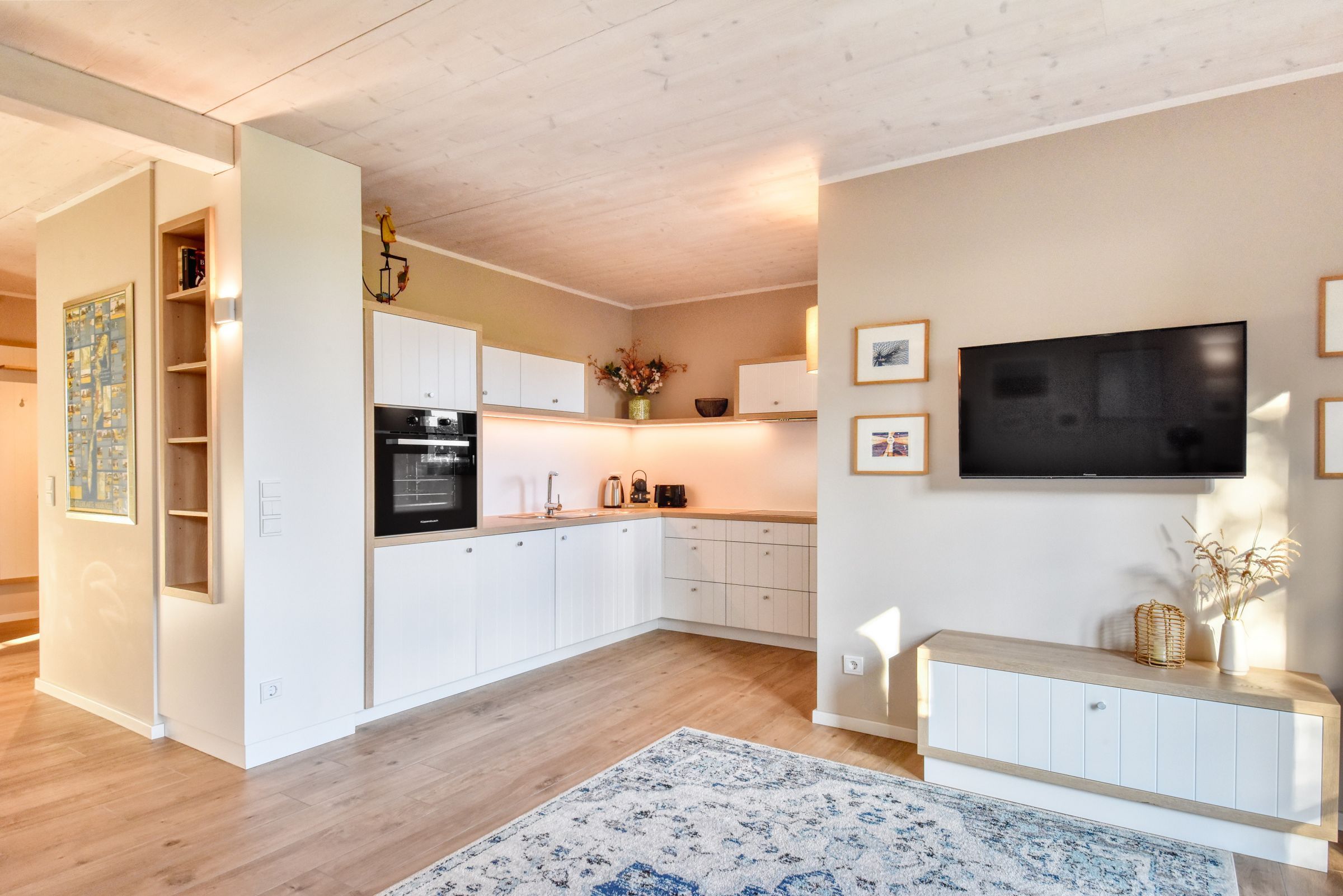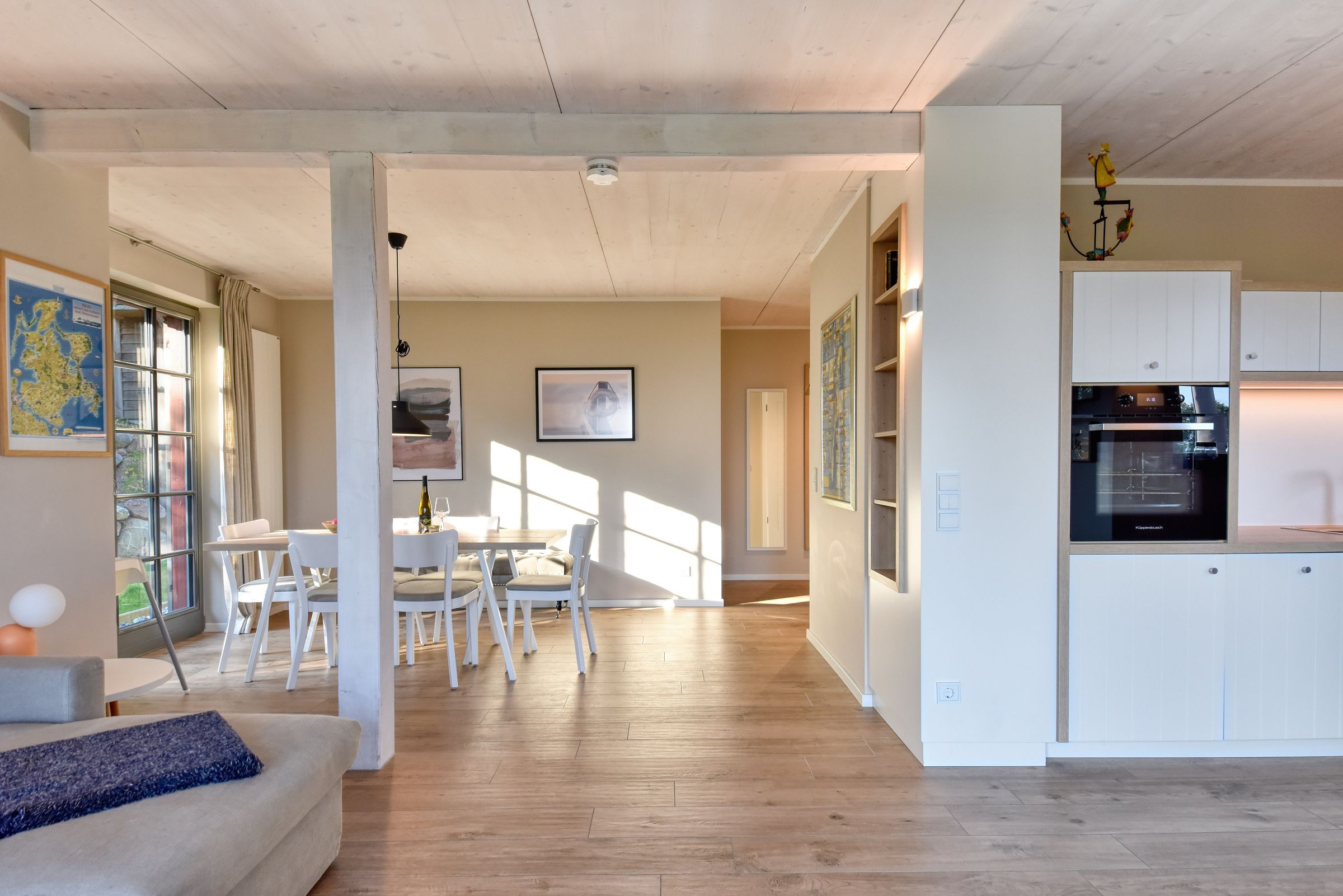 Das Haus verfügt über zwei Schlafzimmer mit Parkettboden sowie ein geräumiges Wohnzimmer mit Fliesenboden und Kaminofen, der für behagliche Wärme und ein angenehmes Ambiente sorgt. Die offene Küche ist komplett ausgestattet und mit Cerankochfeld, Backofen, Kühlschrank, Geschirrspüler sowie umfangreichen Küchenutensilien versehen. Direkt angrenzend bietet sich der Ess- und Wohnbereich als zentraler Raum zum gemeinsamen Verweilen an.