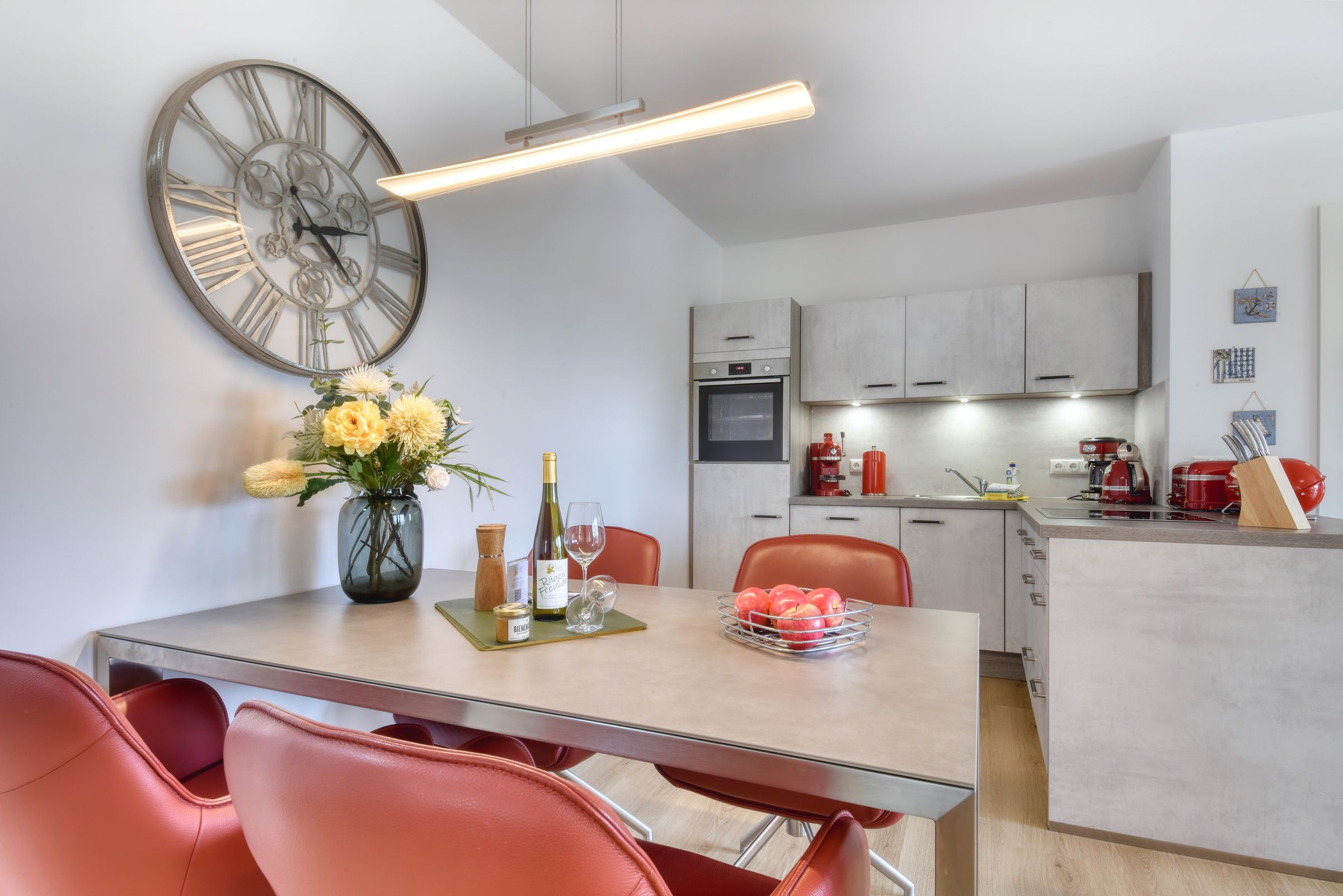Das weiträumige Wohnzimmer hat bodentiefe Fenster, die viel Helligkeit in den Raum lassen. Auf dem gemütlich warmen Sofa oder auf dem stylischen Freischwinger-Ledersessel haben Sie die besten Plätze für tolle TV-Abende. In der voll ausgestatteten L-förmigen Küche mit Küchentresen finden Sie alles was das Kochherz begehrt: Hochwertige Markengeräte, schickes Geschirr und Besteck lassen den Kochabend im Urlaub zu einem echten kleinen Event werden. Serviert wird auf dem massiven Esstisch mit bequemen Armlehnen-Lederstühlen in unmittelbarer Nähe zur Küche. Für Kaffeeliebhaber steht neben einem Kaffeevollautomaten von KitchenAid auch eine Kapselmaschine von Nespresso bereit.