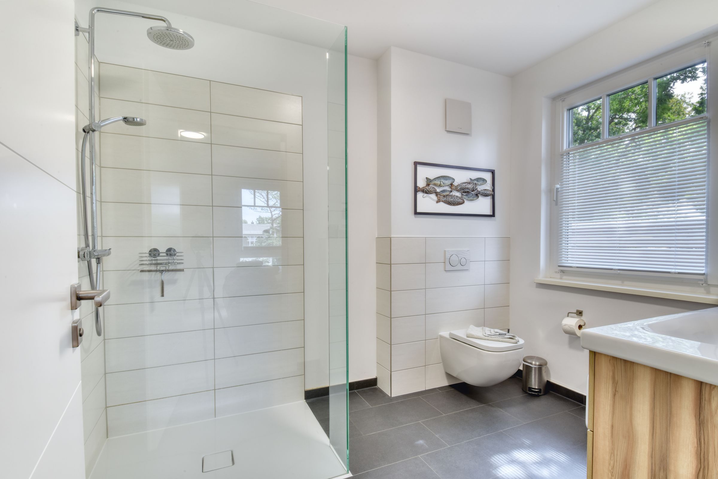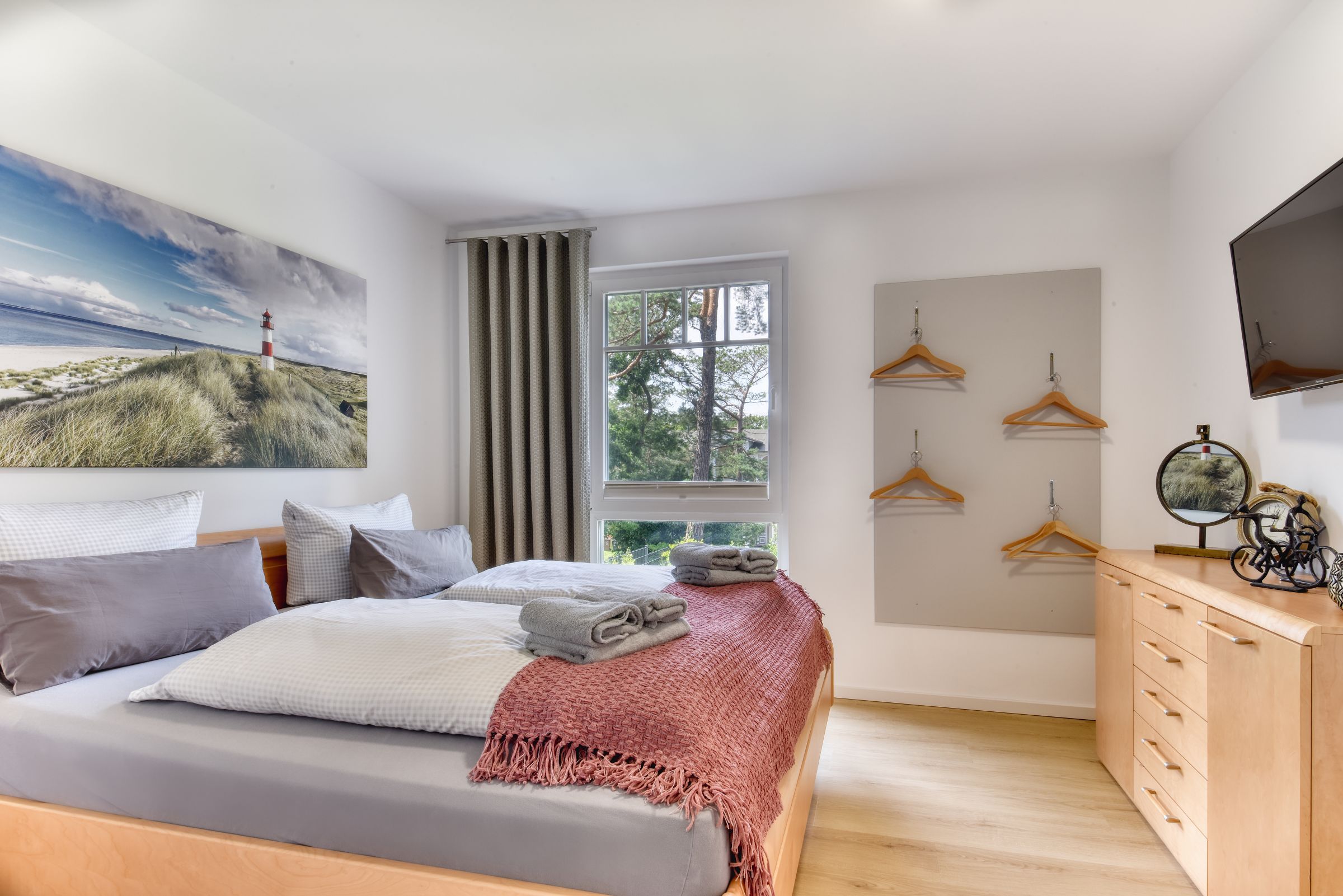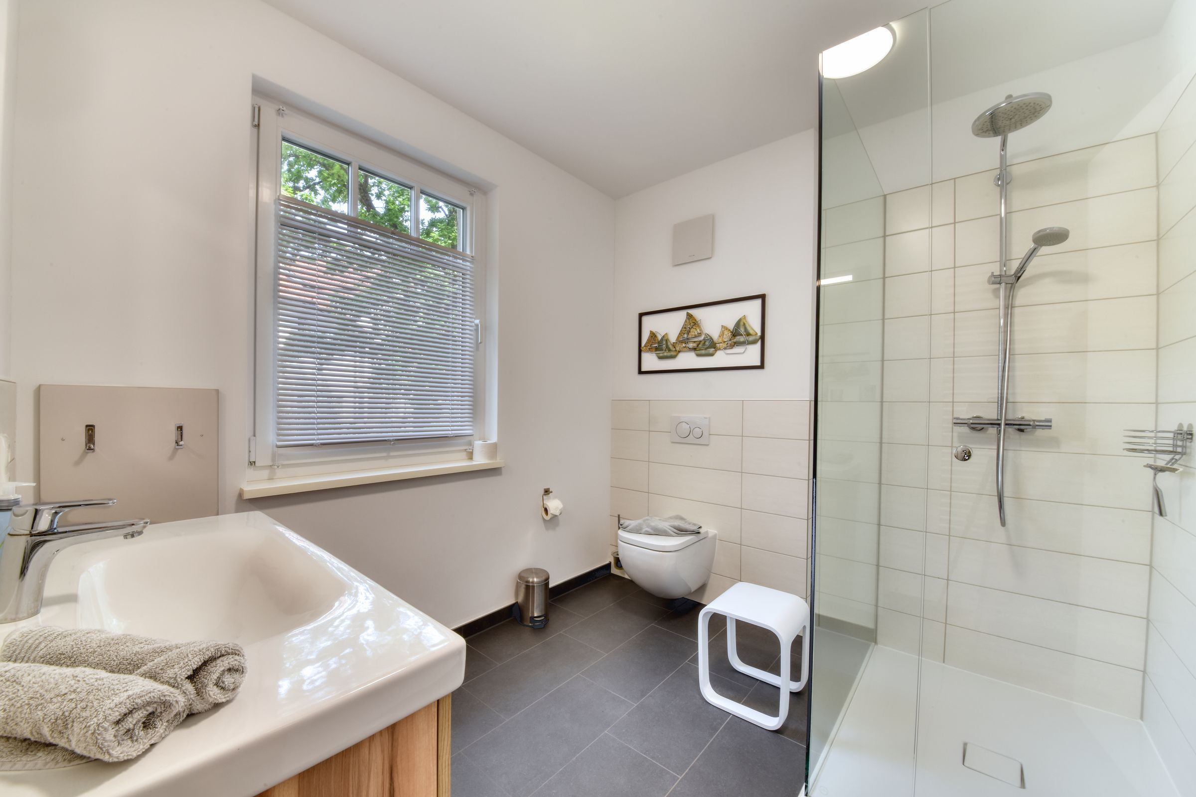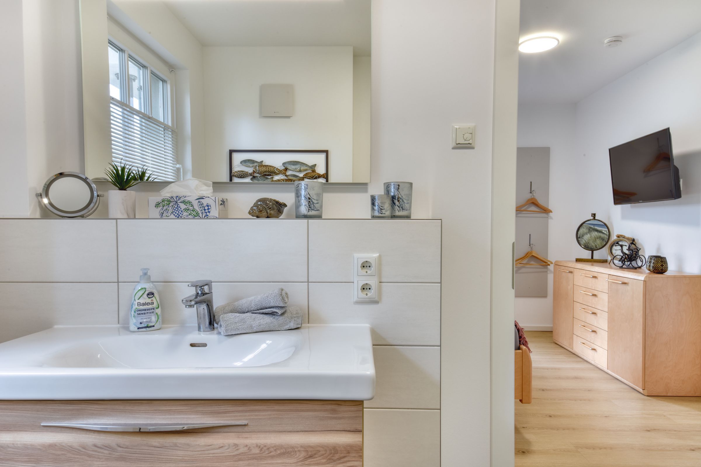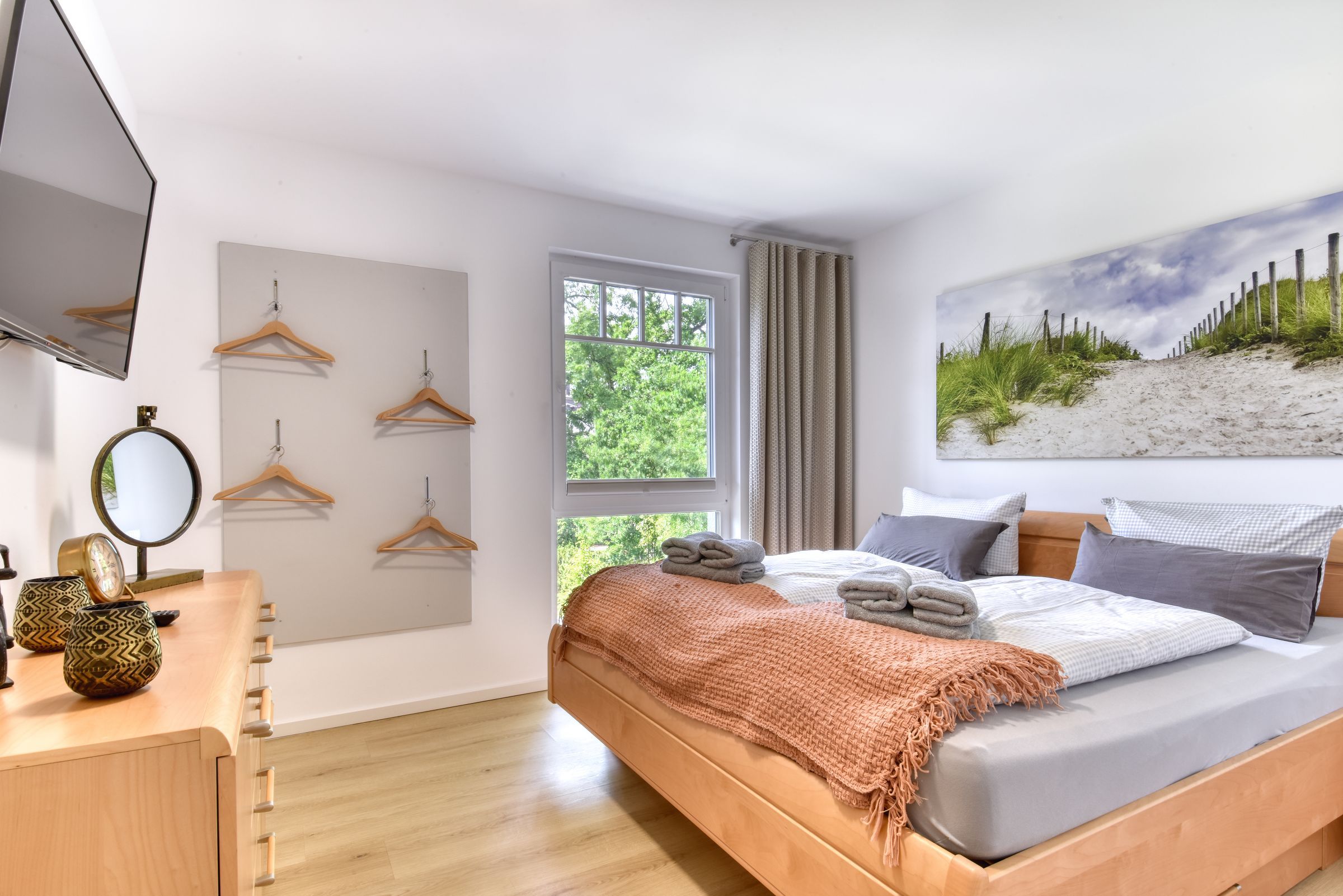 Beide Schlafzimmer dieser Ferienwohnung versprechen erholsame Nächte, dank hochwertiger Matratzen und bieten Zugang zu jeweils einem Badezimmer mit wellnessartiger Regendusche, Waschtisch, Ablageflächen und WC. Es gibt reichlich Ablagemöglichkeiten in allen Zimmern und am Anreisetag sind die Betten bezogen und es liegen Hand- und Badetücher für alle Mitreisenden bereit.
