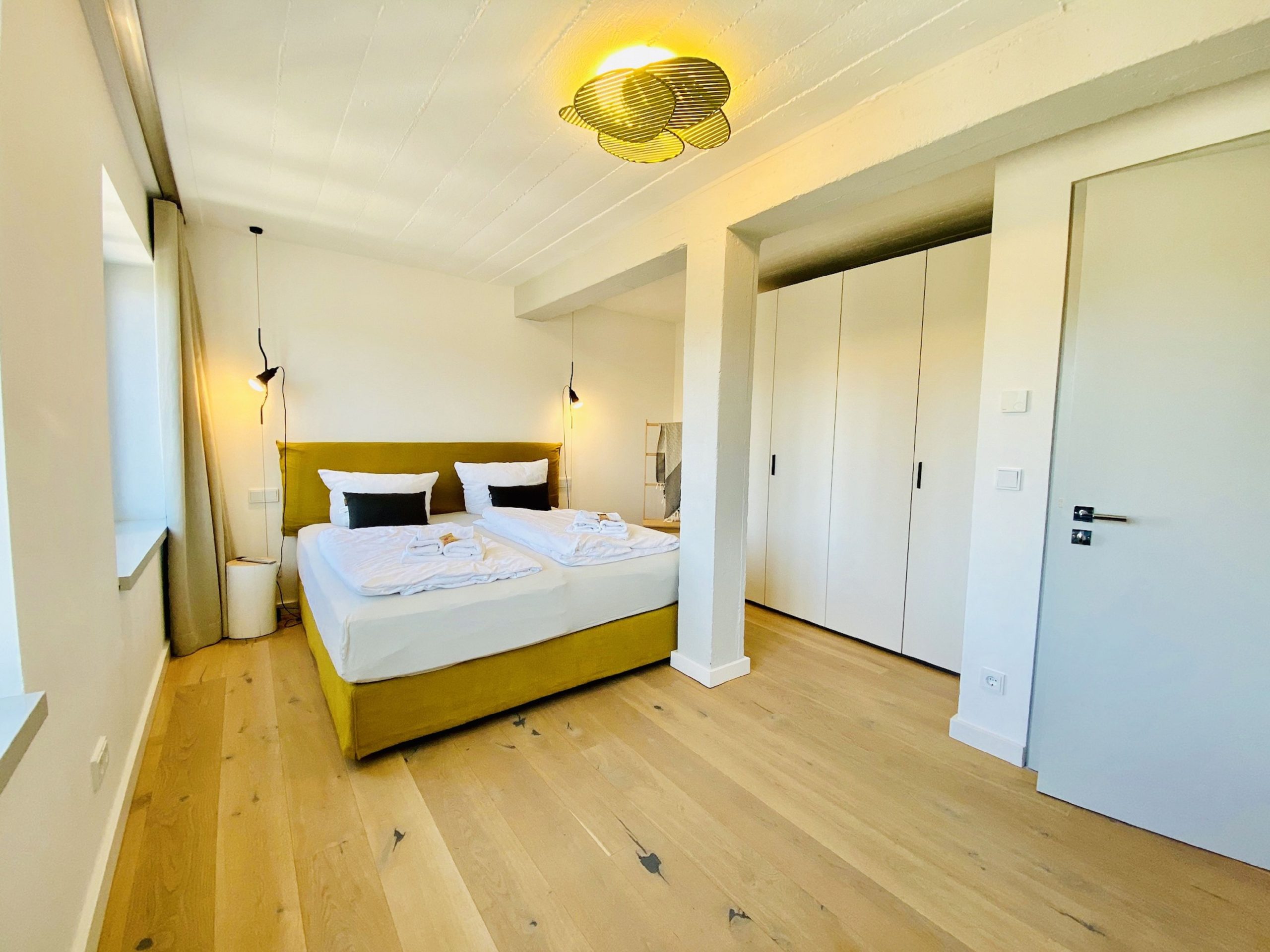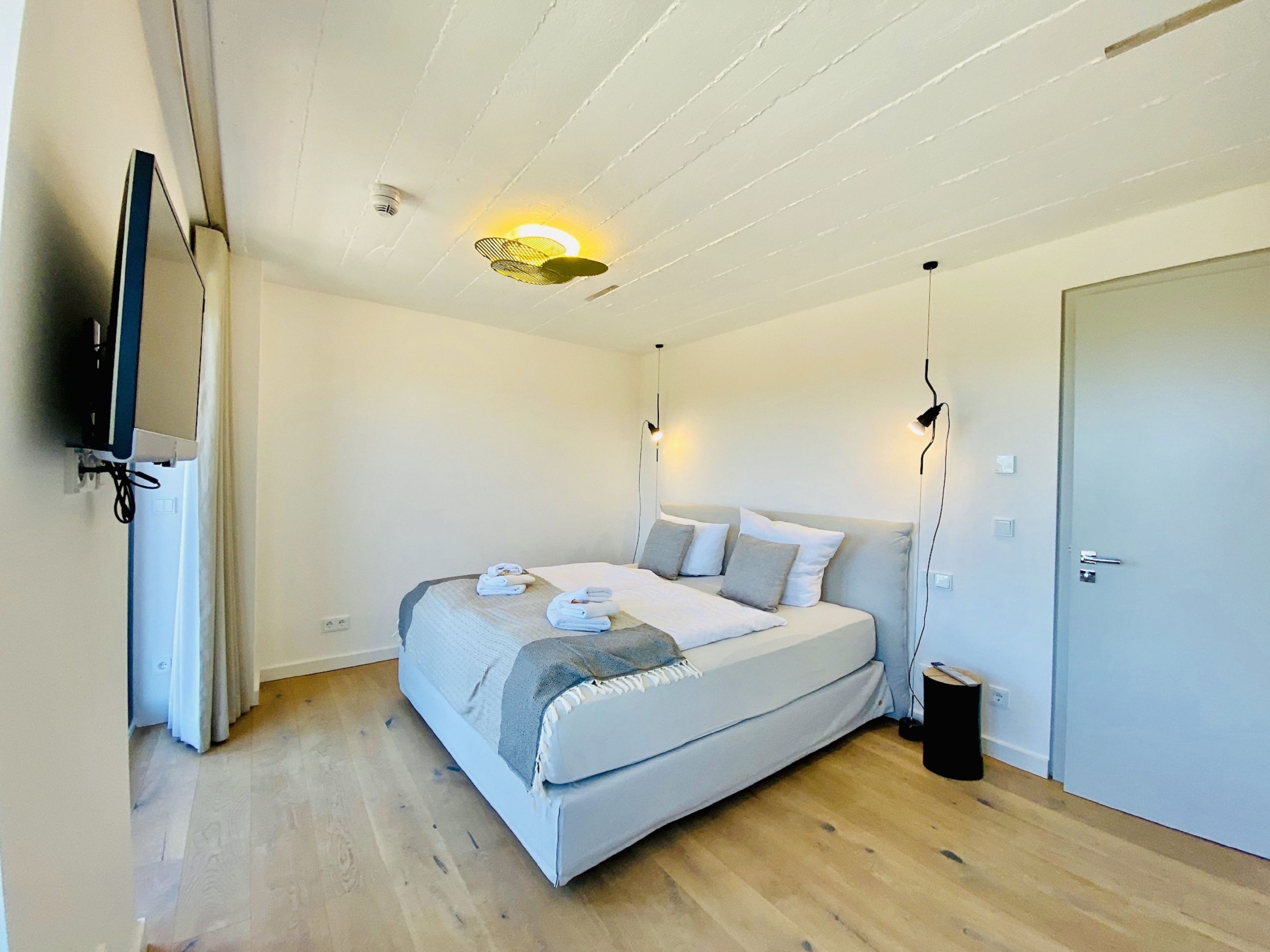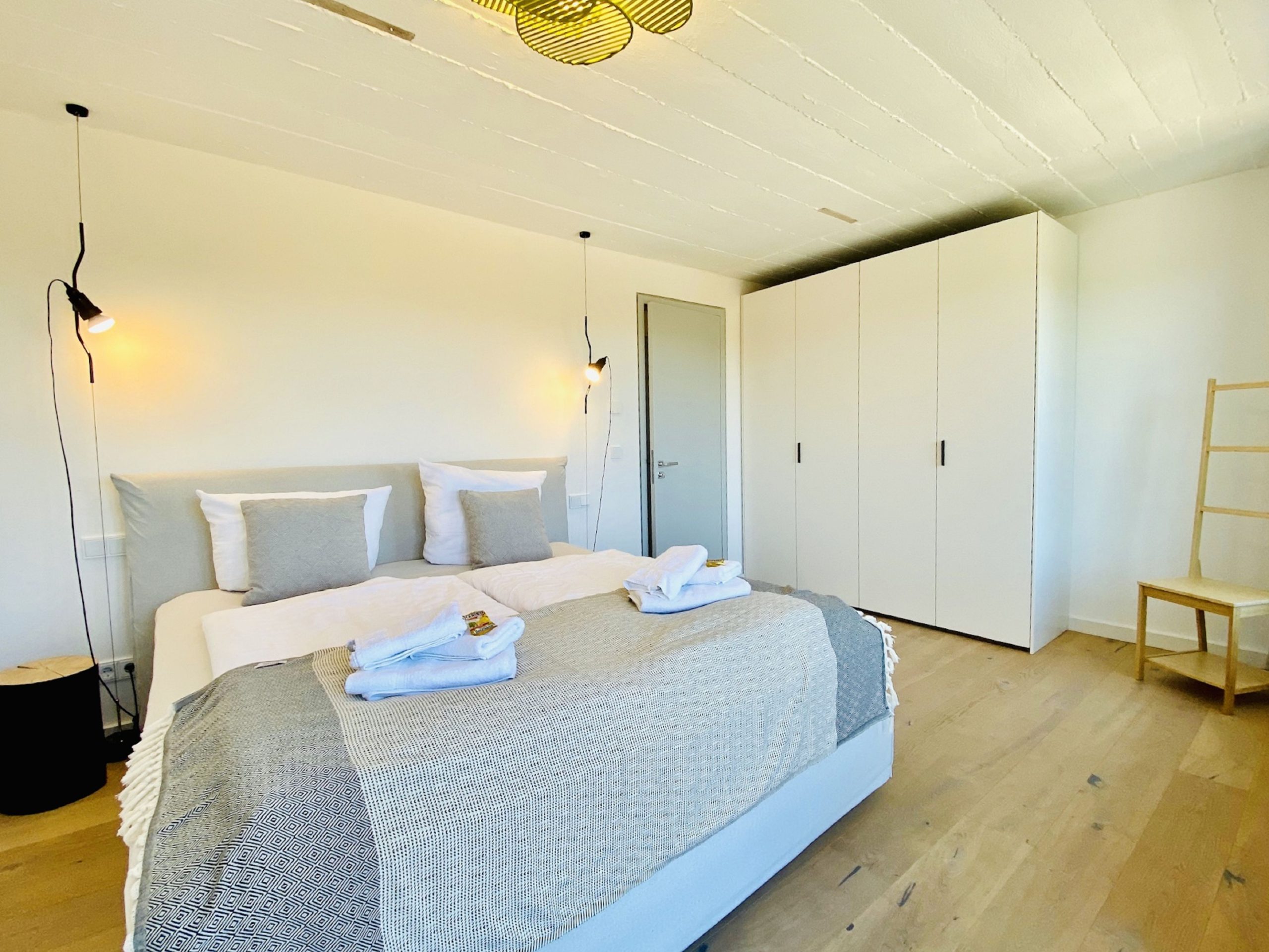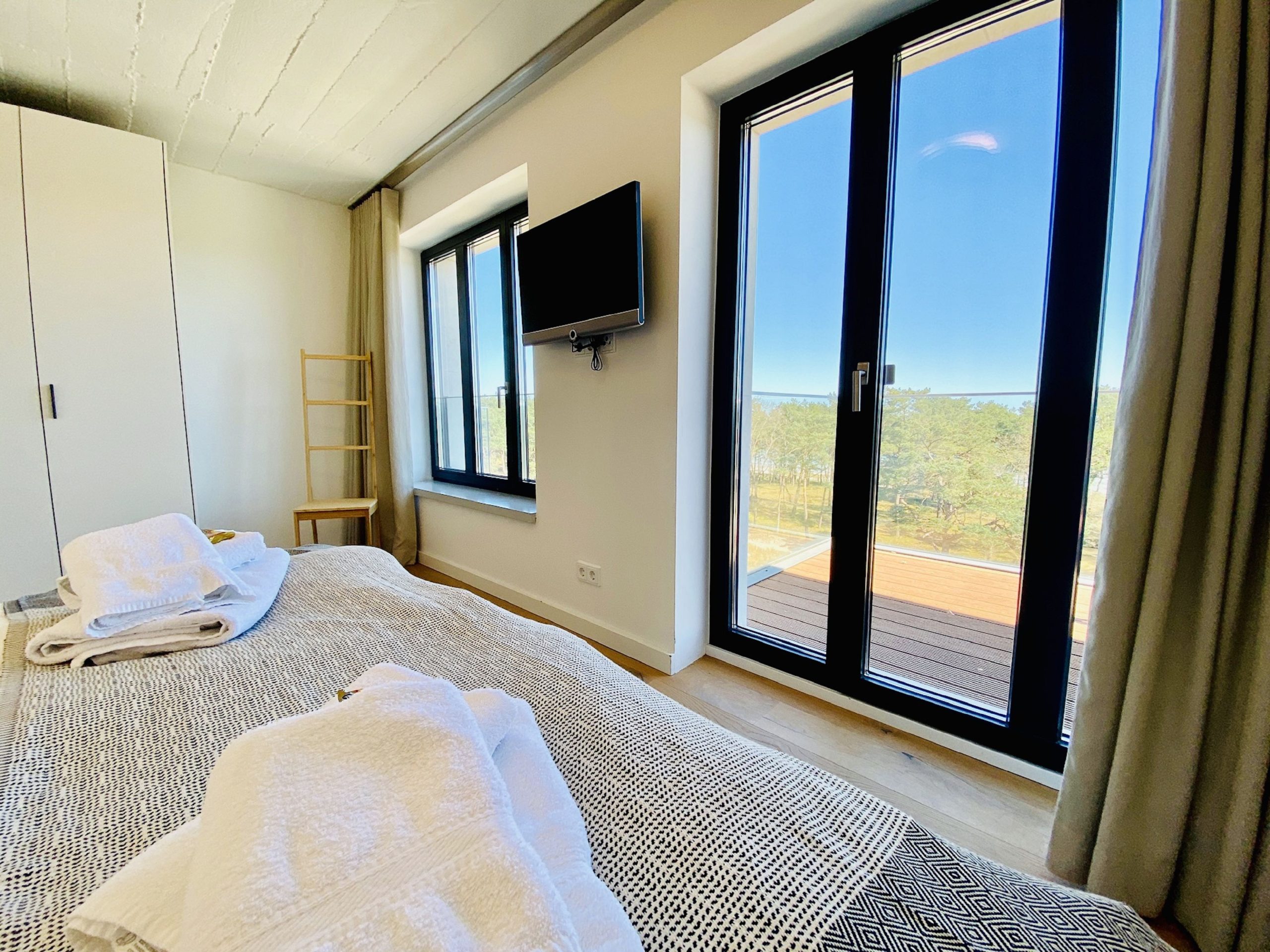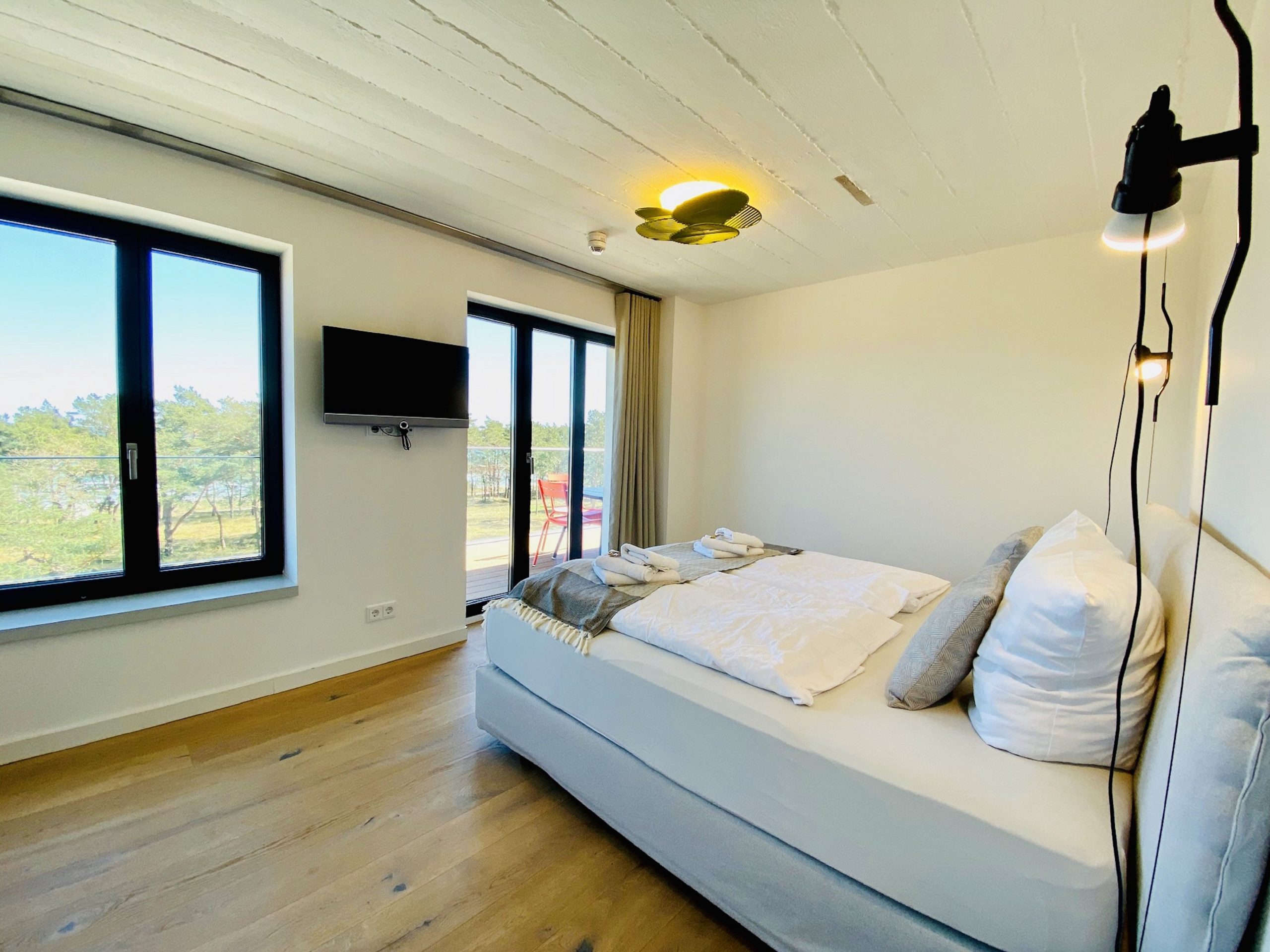 Beide Schlafzimmer versprechen erholsame und entspannende Nächte. In den großen Boxspringdoppelbetten der Marke Schramm wird das Schlafen zum Vergnügen. Das Seeblick-Schlafzimmer hat neben einem Flachbild-TV auch ein En-Suite Badezimmer mit ebenerdiger Regendusche, Waschtisch und WC. In diesem Masterbad wartet zudem eine kleine Wellness-Oase darauf, Ihnen noch mehr Entspannung zu verschaffen. Eine klassische Sauna von der Firma RUKU ist der ideale Ort, sich an ungemütlichen Tagen die Zeit zu verschönern – besonders nach einem stürmischen Strandspaziergang. Auch Ablagemöglichkeiten gibt es in den Zimmern reichlich.