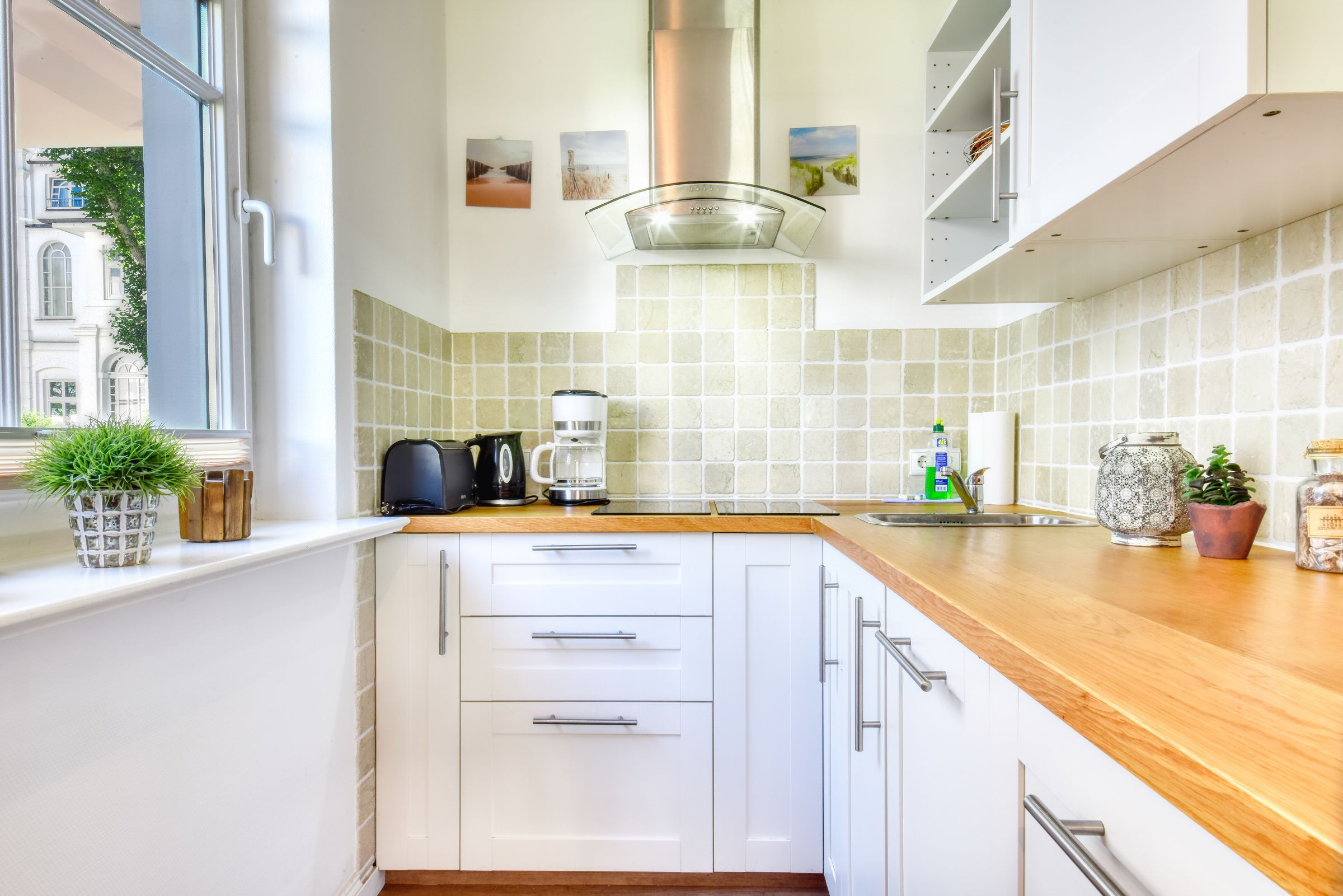 Die Ferienwohnung "Sonnendeck" in Binz liegt in der Villa Seeadler und somit direkt am Strand. Genießen Sie hier die Nachmittagssonne auf der schönen Terrasse in grüner Lage. Die Wohnung hat einen hübschen, sonnigen Wohnraum mit Flachbild-TV, Couch, Esstisch und Küchenzeile. Die Küche ist mit Kühlschrank, Geschirrspüler, Herd, Wasserkocher, Toaster, Koch- und Essutensilien ausgestattet. Das Schlafzimmer ist großzügig geschnitten und hat ein extragroßes Doppelbett (2,00 m x 2,00 m).