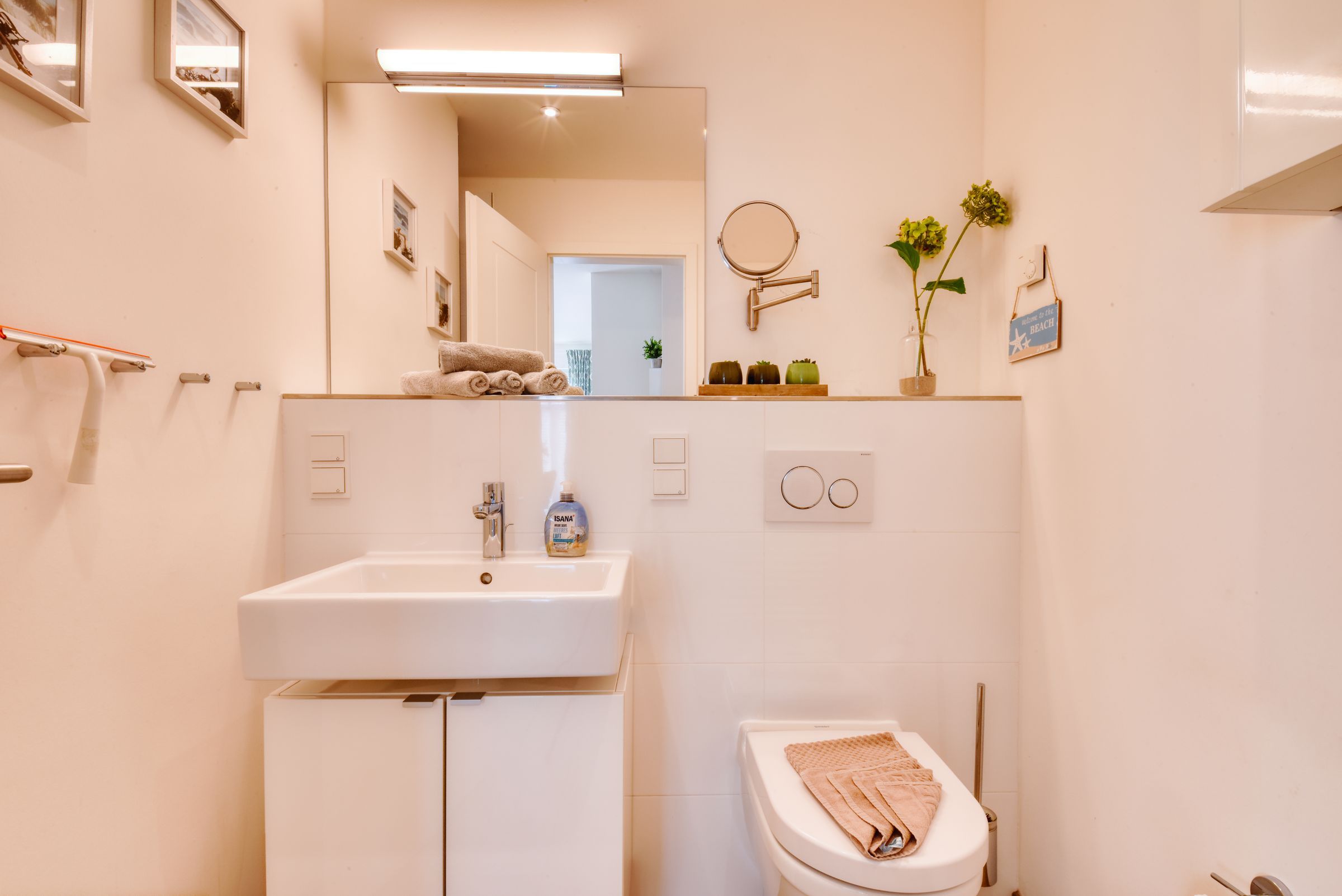 Einbauschrank mit viel Ablagefläche. Das moderne Bad verfügt über Dusche, WC,